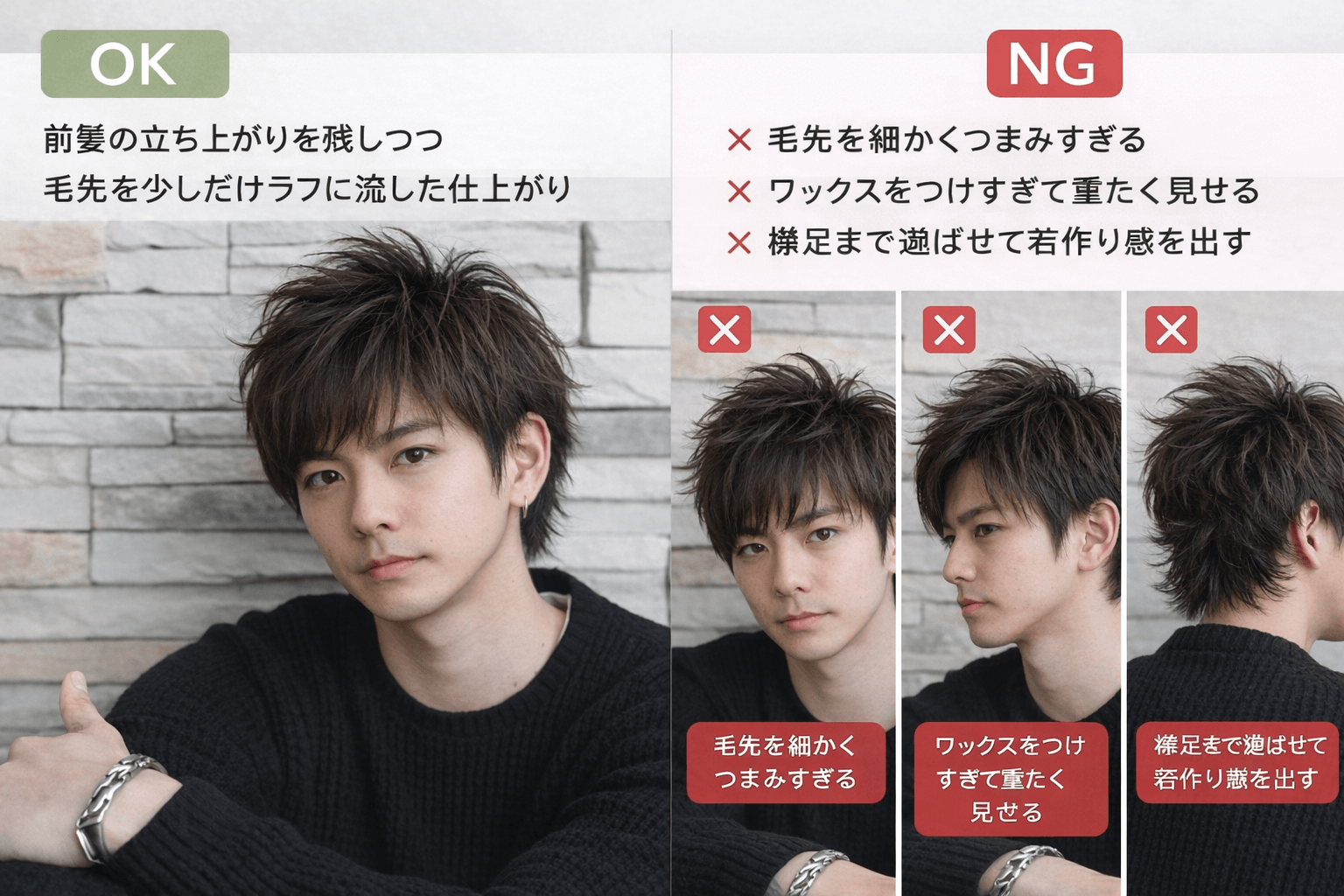 逆に、ジェルでテカテカにしたり、前髪が寝たまま表面だけワックスを塗ると、一気に「若作り感」が出てしまうので要注意です。