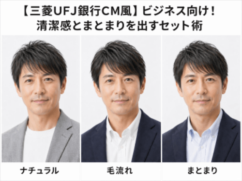A. 束感を作りすぎず、三菱UFJ風の「清潔感」に寄せれば全く痛くありません。マットな質感で自然な毛流れを意識すれば、むしろ年相応の渋さが出ます。